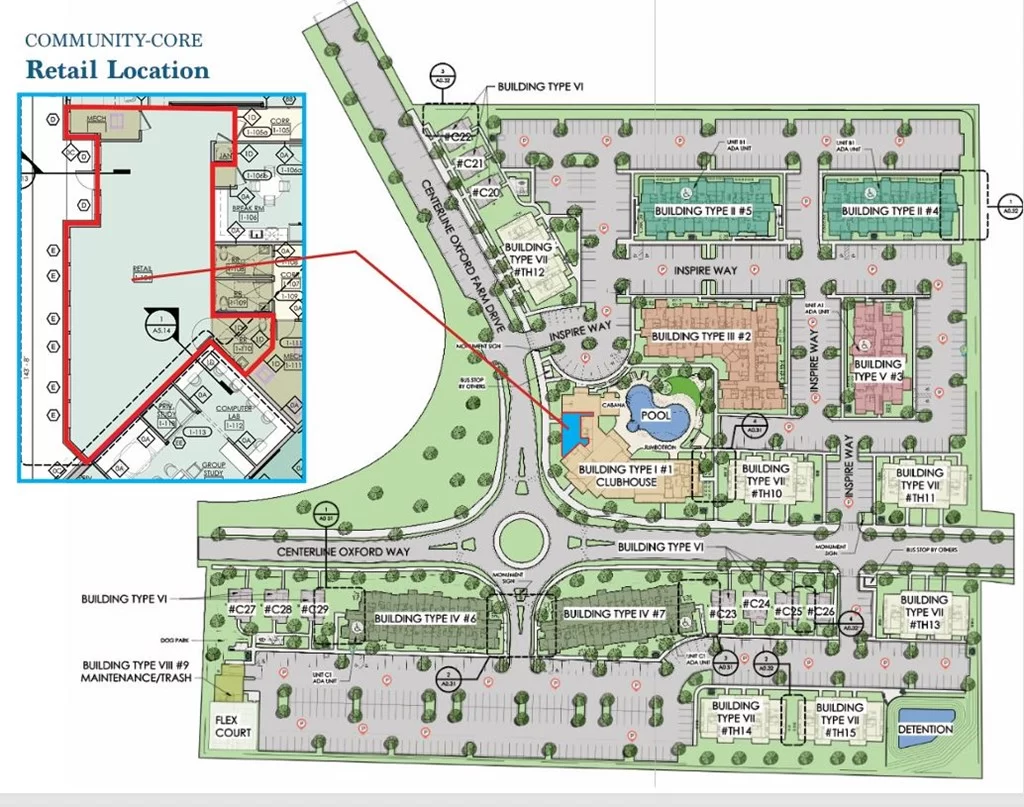 To be completed by August 2026, Ivy & Elm offers a unique setting for a coffee retailer looking to serve a high-value, built in audience (504 beds) close to Oxford’s most popular destinations and is just feet away from the campus bus stop located at the the property. Surrounded by a growing mix of luxury rentals, upscale homes, and the social energy of the Ole Miss community, Ivy & Elm is a natural fit for a coffee QSR. NNN lease, 3 year minimum.